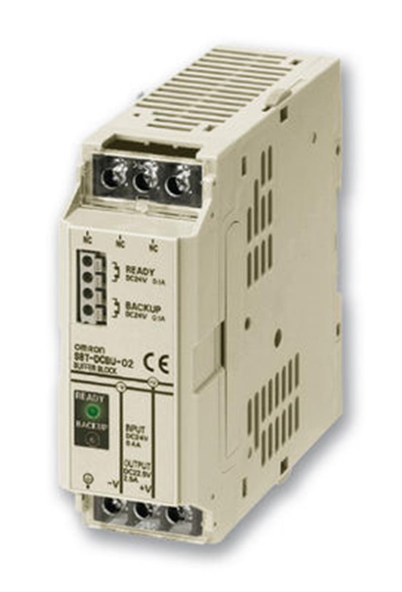 Prévient l'arrêt des appareils, la perte de données et les autres problèmes résultant d'arrêts momentanés de l'alimentation. Un bloc tampon S8TS-DCBU-02 fournit un temps de secours de 500 ms à un courant de sortie de 2,5 A. Il peut être branché à la sortie 24 Vc.c. de n'importe quelle alimentation à découpage.
